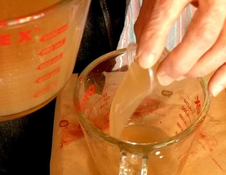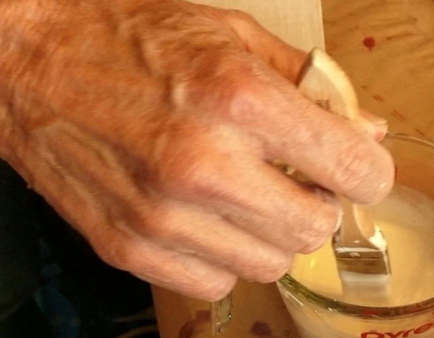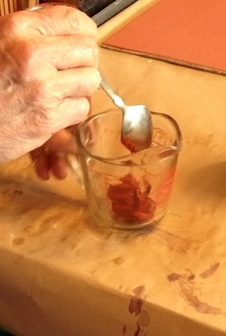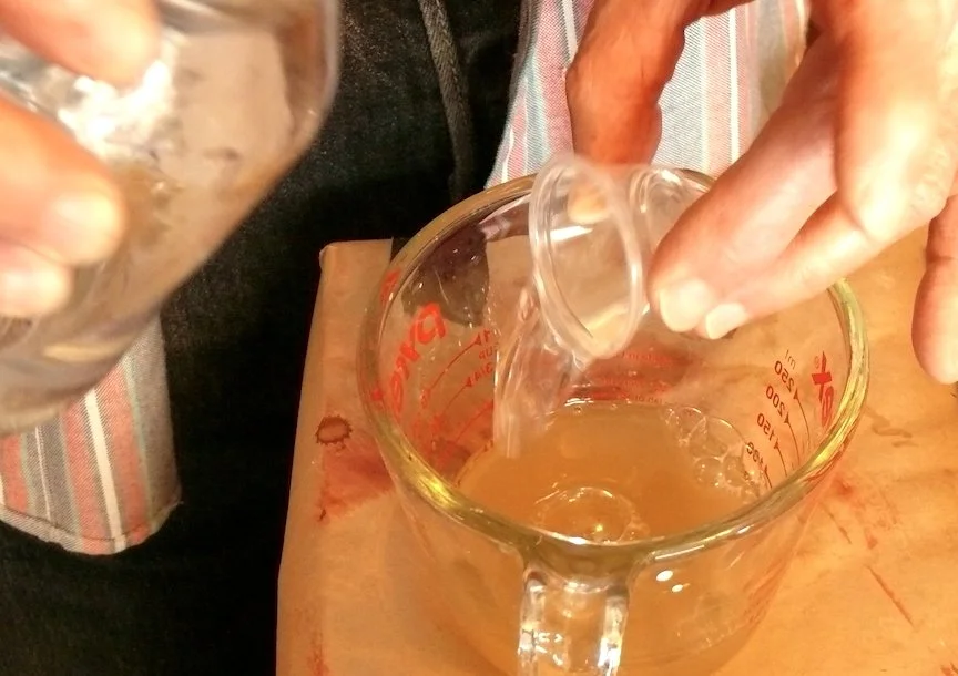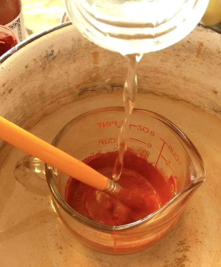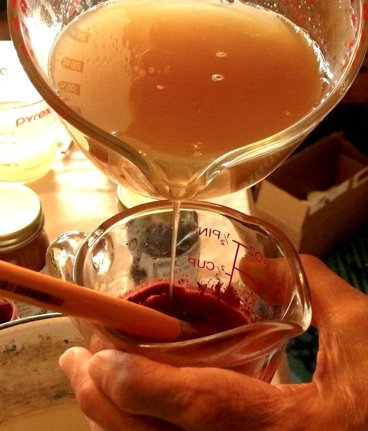 Den warmen Hasenleim gut rühren um eine homgene Mischung zu erlangen