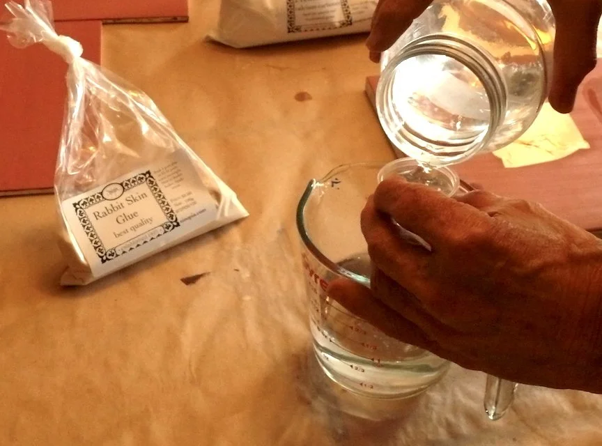 Einen Teil Hasenleim Körner in 12-15 Teile Wasser mischen und aufquellen lassen.