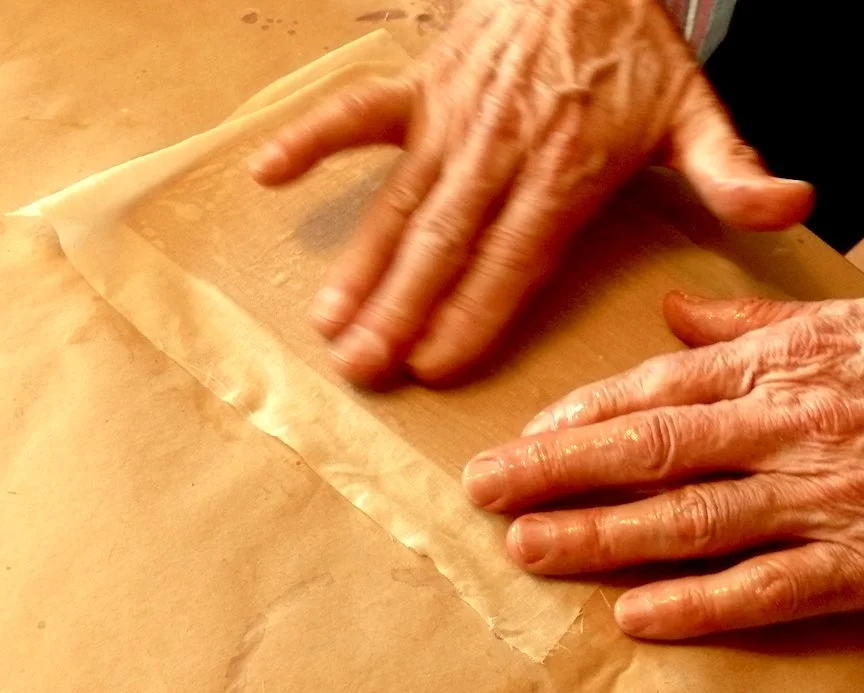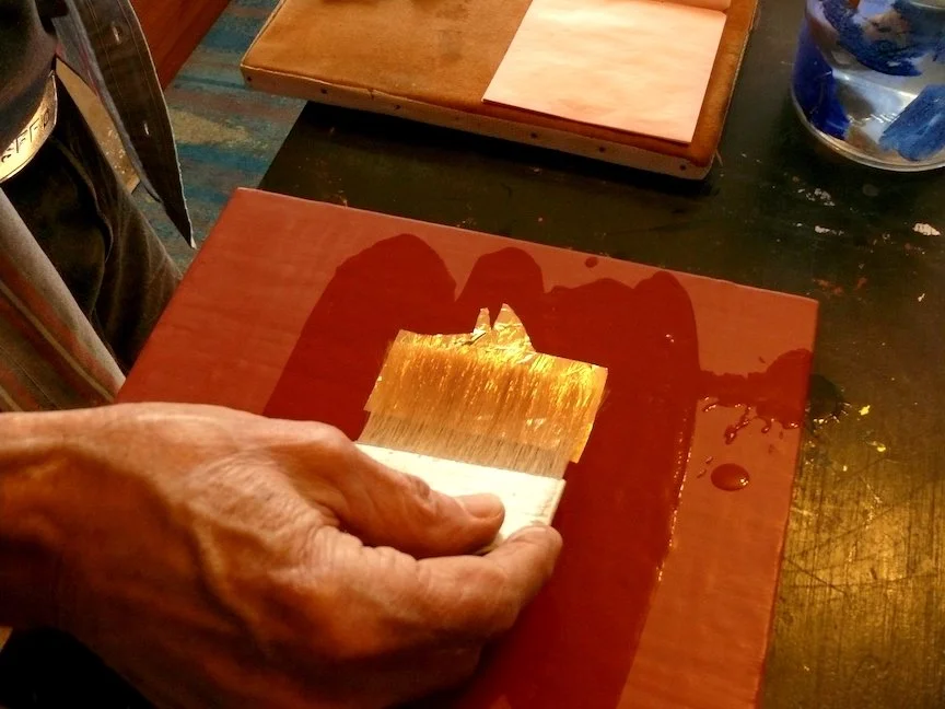 Nachdem das Gold auf dem nassen Poliment liegt, sickert das Wasser in das Poliment und fängt an zu trocknen