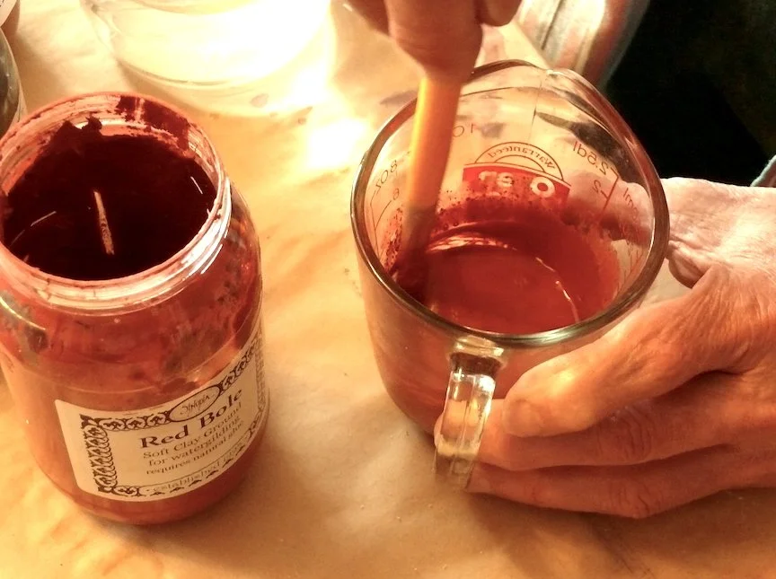 Poliment Mischung langsam erwärmen und genug Wasser hinzufügen, bis das Poliment streichbar wird.