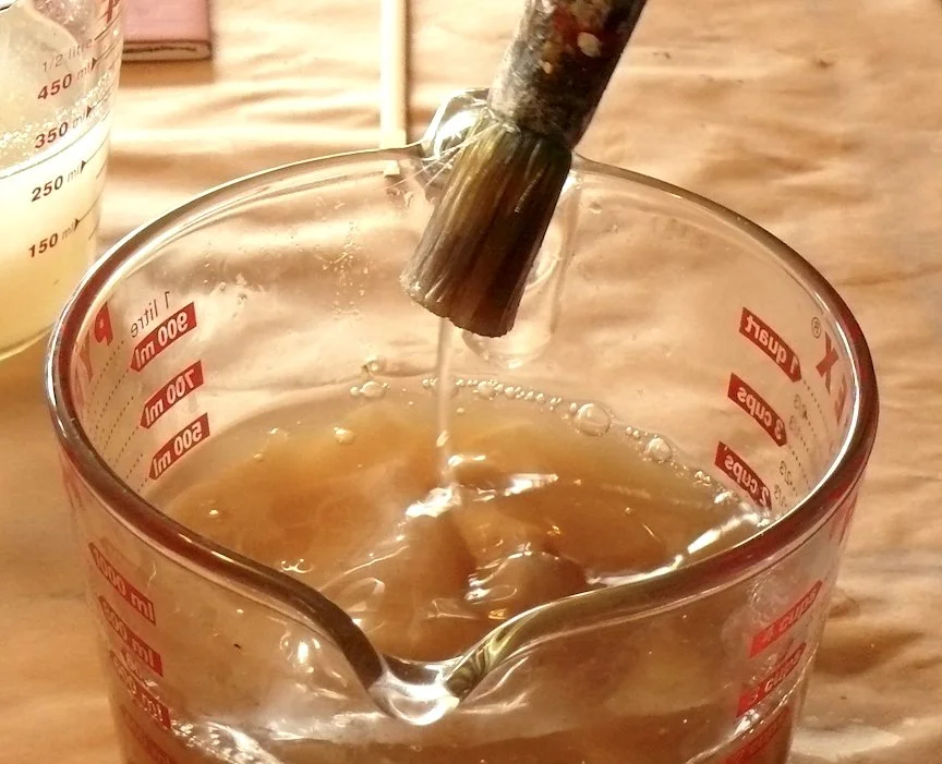 Aufgequollene Hasenleim Mischung langsam erwärmen, ohne die Flüssigkeit zum kochen zu bringen.