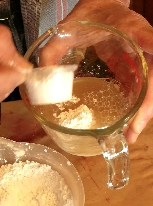 Langsam den warmen Hasenleim hinzufügen, bis die Mischung sich verdichtet (circa 10% Haseneleim).