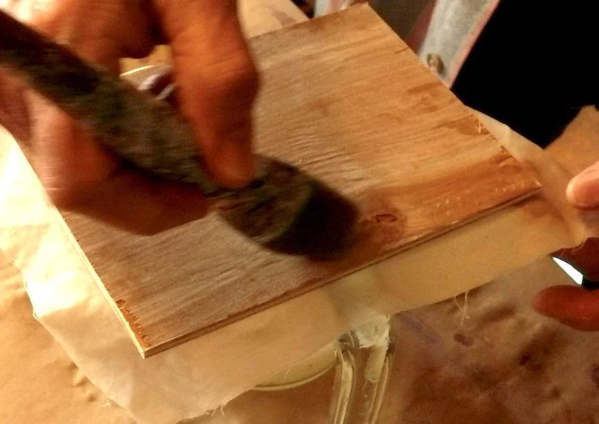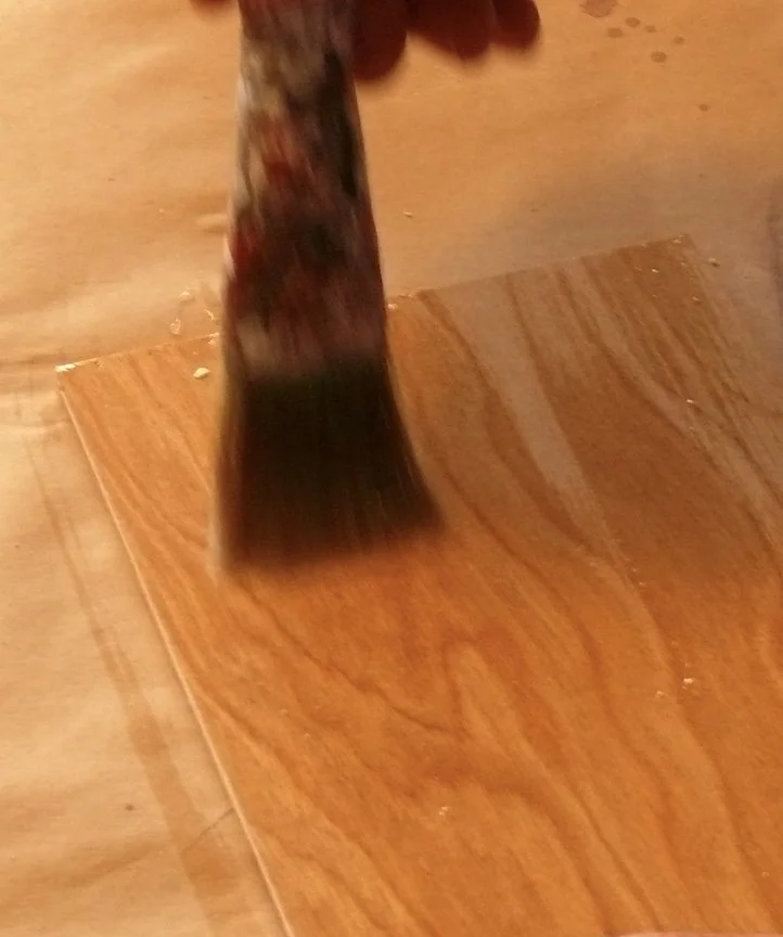 Den Haseleim großzügig auf alle Seiten der Holzfläche mit einem Pinsel auftragen